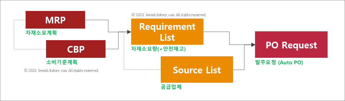 SAP ERP 는 MRP 와 CBP 에서 산출한 자재소요량에 대하여 소스리스트를 참조하여 자동으로 구매요청서(PR)을 생성하는 기능을 제공한다. 자재소요량에는 품목과 수량이 제공되고 생산되어야 하는 품목의 공장에 자재들이 조달될 수 있도록 공급업체의 목록을 포함하는 소스리스트에서 공급업체 정보를 제공 받아 자동 구매요청서를 제공받게 된다.