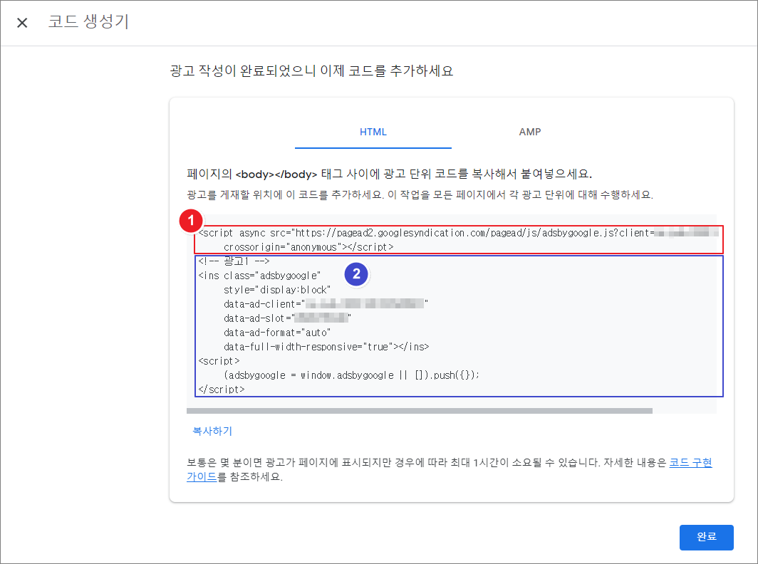 애드센스 광고가 만들어지면 다음과 같이 [코드 생성기] 에서 코드가 만들어진다.
