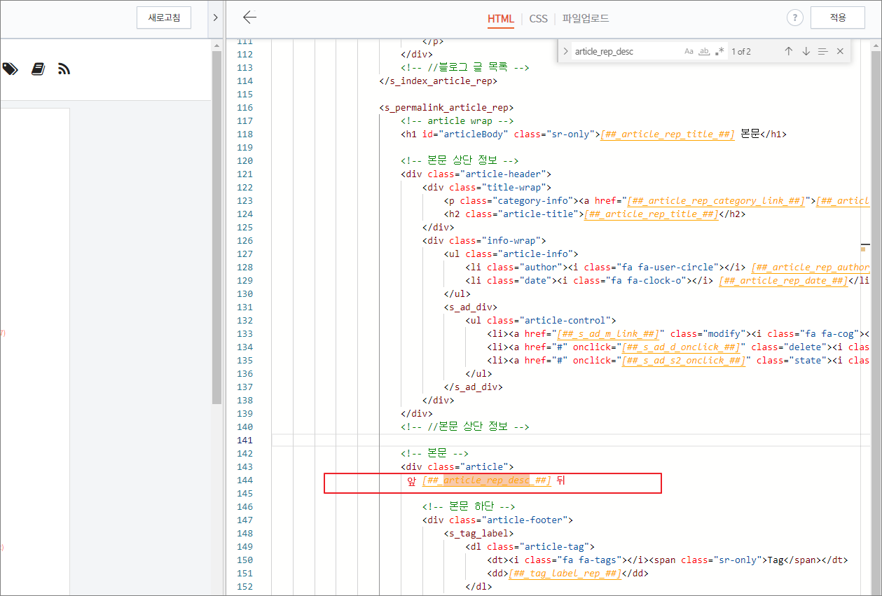 상단과 하단에 광고를 배치하기 위해서 html 편집에 들어와 'article_rep_desc' 를 검색해준다. 광고 태그를 앞에 넣으면 본문 상단, 뒤에 넣으면 본문 하단에 광고가 배치된다.