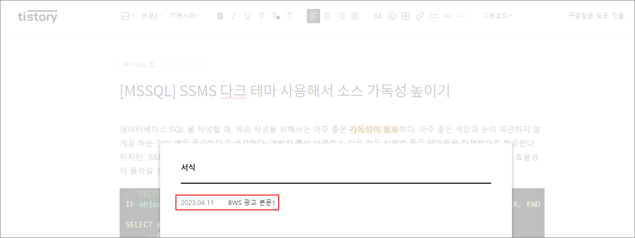 티스토리 글을 작성하고, 본문에 생성 시에는 아래 편집 툴을 이용하여 광고 배치를 [서식] 기능으로 넣어줄 수 있다.